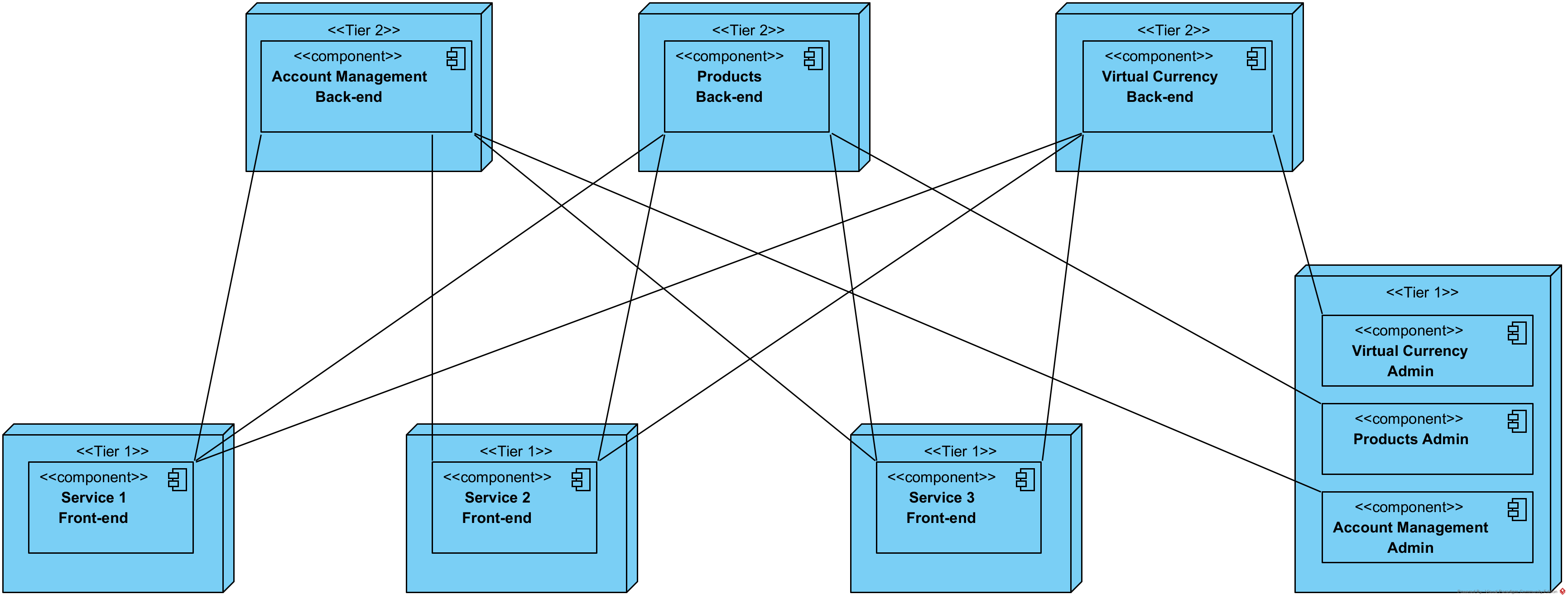 For example, different public facing services can share back-end services, such as virtual currency transactions or phone line credit rates, but each has their own configuration on each back-end service, and each back-end service has its own front-end config pages. The deployment diagram below illustrates this.
