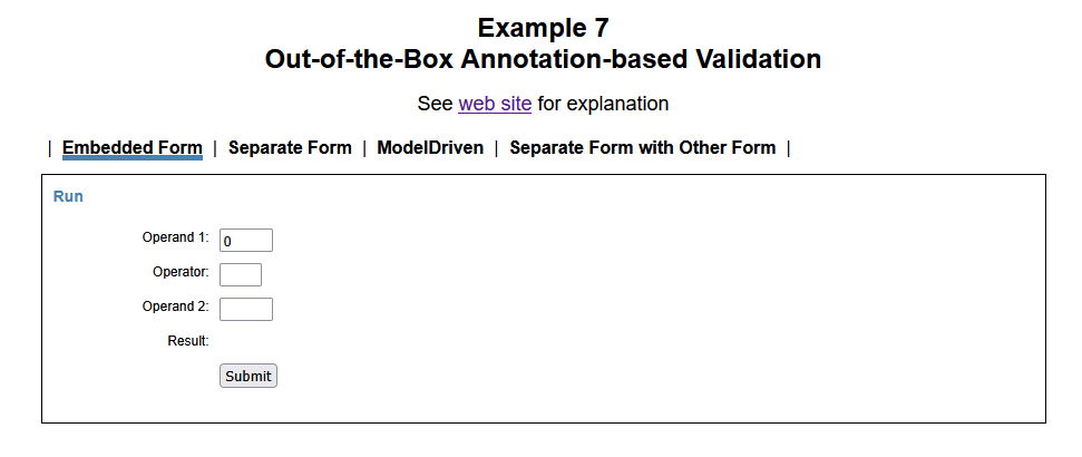 A demonstration application can be accessed here. It uses the default interceptor stack, not the interceptors described in later articles. The start page looks like the following. Enter empty or junk values to test form validation.